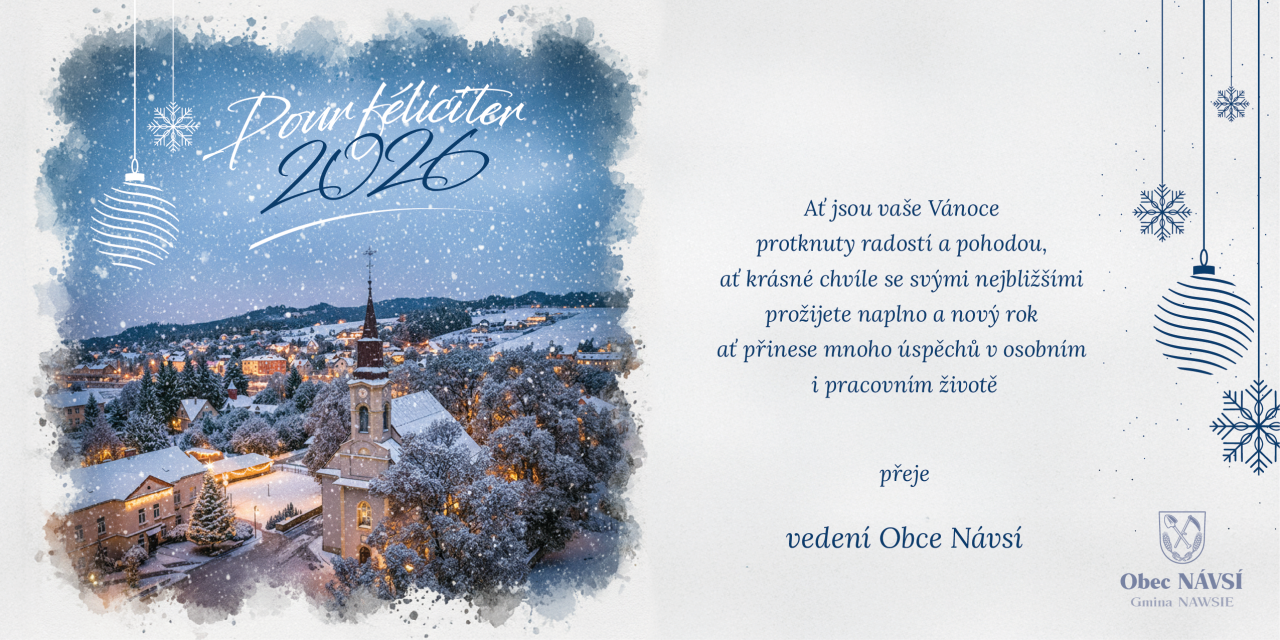 Zpět na úvod · Aktuality z obce Aktuality z obce PF 2026: Krásné Vánoce a hodně štěstí Vyvěšeno: 18. prosince 2025 Vedení obce Návsí přeje všem občanům pokojné svátky a vše nejlepší do nového roku. Dokumenty ke stažení image-1.jpg Tento obsah byl automaticky vytvořen AI redaktorem na základě úředních dokumentů. Originál najdete na navsi.cz.